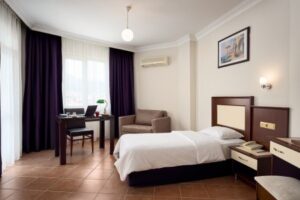 Hotel, postavený v roce 2006, disponuje 127 pokoji a nabízí široké spektrum služeb. Hosté jsou vřele vítáni v moderní vstupní hale s recepcí, kde mohou využít úschovnu zavazadel, hotelový sejf a směnárnu. Pro pohodlí hostů je k dispozici Wi-Fi v celém objektu. V hotelu najdete restaurace, jídelnu, kavárnu, bar a plážový bar. Součástí areálu jsou také obchody a supermarket. Hotel je obklopen krásnou zahradou s hřištěm a TV místností. Pro hosty, kteří přijeli vlastním autem, je k dispozici parkoviště za poplatek.