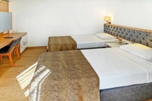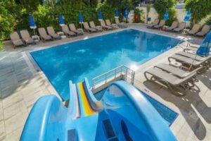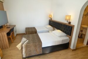 Vybavení hotelu zahrnuje recepci s možností směnárny, restauraci, bar, TV místnost, výtah, internetovou kavárnu, bazén, dětský bazén, skluzavky, lehátka a slunečníky u bazénu a plážový volejbal. Ubytovací možnosti zahrnují 2lůžkové pokoje s možností 1 přistýlky pro dospělého nebo dítě, individuální klimatizaci, trezor (za poplatek), minibar (za poplatek), SAT/TV, telefon, sociální zařízení, vysoušeč vlasů, balkon a WiFi připojení (za poplatek).