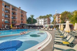 Hotel Sunpark Garden se nachází v centru Alanyi a nabízí skvělou polohu pro cestovatele, kteří chtějí být v blízkosti města a pláže. Pláž s jemným pískem je vzdálena přibližně 1,5 km od hotelu, a hotel poskytuje zdarma minibus na pláž, což je velmi pohodlné. Pláž má pozvolný vstup do moře a je vybavena barem, sprchami a toaletami. Lehátka, slunečníky a plážové osušky jsou k dispozici za poplatek.