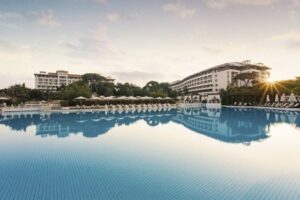 Ela Excellence Resort je luxusní prázdninový komplex přímo u 250 m dlouhé písečné pláže v letovisku Belek, cca 2 km od centra. Areál rozprostírá na více než 100 000 m2, zahrnuje hlavní budovu pro rodiny a klidnější část s vilkami pro páry. V okolí nalezneme restaurace, bary a obchody, a golfové hřiště jsou vzdáleny 3 km. Mezinárodní letiště Antalya je od resortu vzdáleno přibližně 25 km.