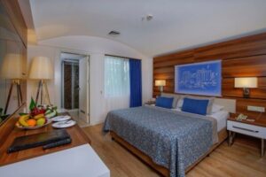 Ubytování v hotelu je elegantní a prostorné, včetně dvoulůžkových pokojů s možností až dvou přistýlek. Každý pokoj má vlastní sociální zařízení, telefon, klimatizaci, minibar a balkon nebo terasu. Hotel také nabízí speciální pokoje pro handicapované hosty a rodiny s dětmi. Stravování je zajištěno systémem ultra all-inclusive, zahrnujícím plnou penzi, lehké občerstvení během dne a neomezené množství alkoholických a nealkoholických nápojů místní výroby. Hosté mohou také využít návštěvu některé ze šesti stylových à la carte restaurací.