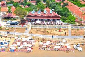 Pláž je krásná a písčitá s pozvolným vstupem do moře. Hosté mohou využívat lehátka se slunečníky, které jsou zdarma k dispozici. Plážový bar je také k dispozici, a hosté zde mohou v klidu relaxovat a užívat si slunečního dne.