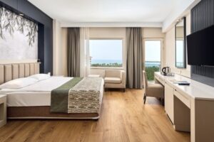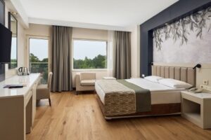 Hotelový resort disponuje 540 moderně zařízenými pokoji, které jsou rozmístěny v pětipatrové budově obklopené krásnou udržovanou zahradou. Klientům jsou k dispozici různé vybavené prostory, včetně vstupní haly s recepcí, směnárnou, lobby barem, internetovou kavárnou (za poplatek), WiFi v lobby a na pokojích zdarma, restauracemi, a la carte restauracemi, bary, diskotékami, obchody, Spa a wellness centrem, bazény, aquaparkem, tenisovým kurtem, fitness centrem, miniklubem, dětským bazénem, dětským hřištěm a sportovišti.